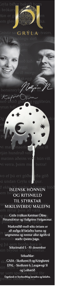 Þau Katrín Ólína Pétursdóttir og Hallgrímur Helgason leggja Styrktarfélagi lamaðra og fatlaðra lið í ár við hönnun Jólaóróans – Grýlu. Katrín Ólína fæst við stálið en Hallgrímur við orðin. Grýla er ein þekktasta þjóðsagnapersóna okkar Íslendinga. Hún er móðir jólasveinanna og sinnir því vandasama hlutverki að ala þá ólátabelgina upp. Grýla á sinn stað í hugum okkar flestra, en gráglettnar frásagnirnar vekja gjarnan minningar úr barnæsku. Markmið með gerð og sölu Grýlu er að auðga líf fatlaðra barna og ungmenna. Allur ágóði rennur til Æfingastöðvar Styrktarfélags lamaðra og fatlaðra.