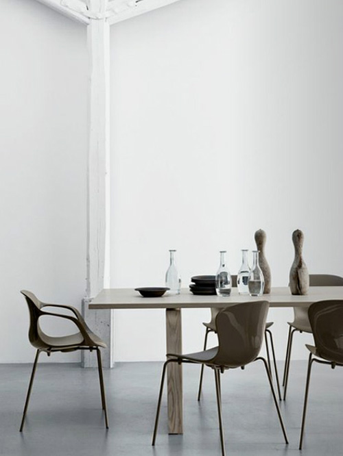 Stóllinn er framleiddur í fjórum litum; Milk white, Butter yellow, Pepper grey og Coffee brown. / Mjólkurhvítur, smjörgulur, pipargrár og kaffibrúnn.