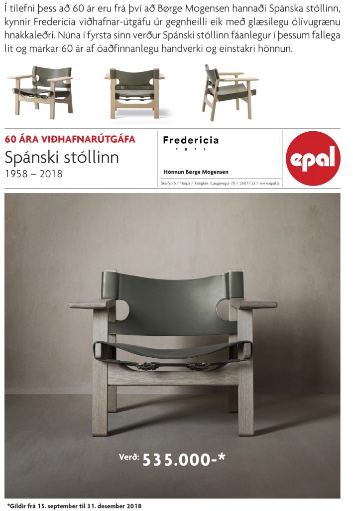 Í tilefni þess að 60 ár eru frá því að Spánski stóllinn var hannaður kynnir Fredericia viðhafnarútgáfu úr gegnheilli eik með glæsilegu ólívugrænu hnakkaleðri. Til heiðurs verka Børge Mogensen hefur Fredericia farið í gegnum skjalasafn meistarans og uppgötvað þennan náttúrulega lit sem var jafnframt í uppáhaldi hjá Mogensen og var afar ríkjandi á heimilum á þessum tíma. Núna í fyrsta sinn verður Spánski stóllinn fáanlegur í þessum fallega lit og markar 60 ár af óaðfinnanlegu handverki og einstakri hönnun.