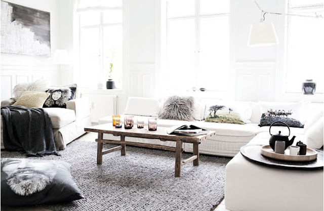 By Nord púðar og sófateppi í stofunni.