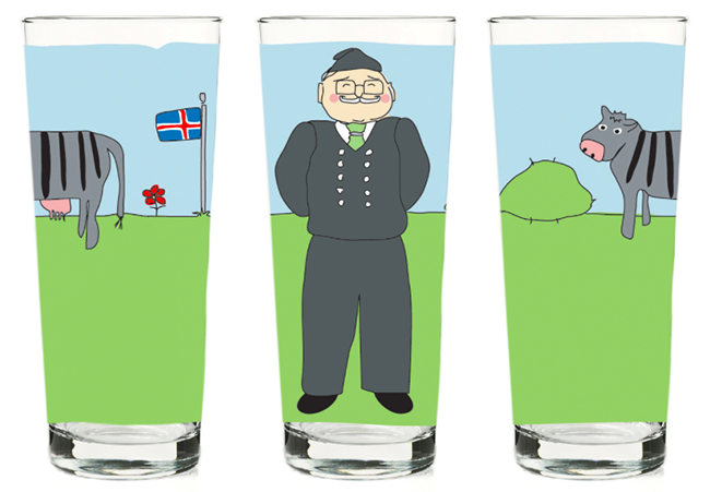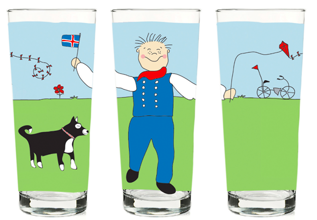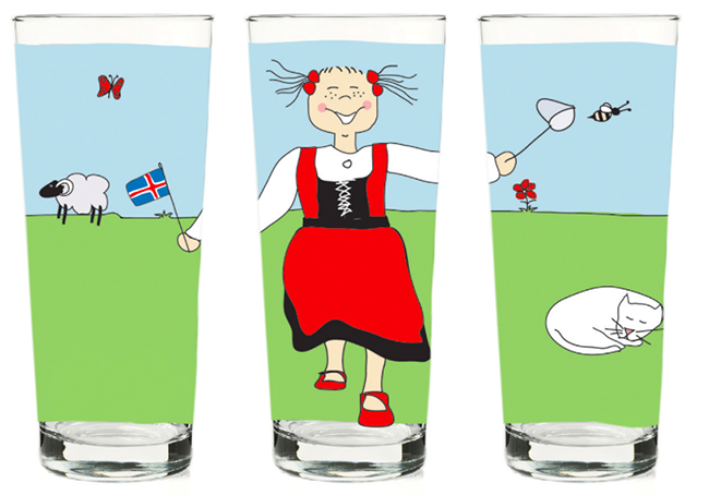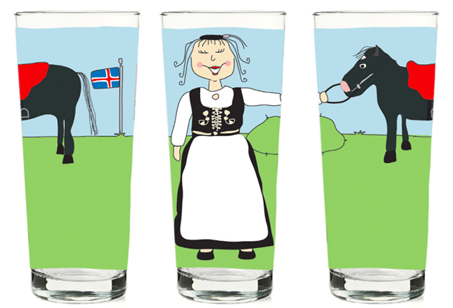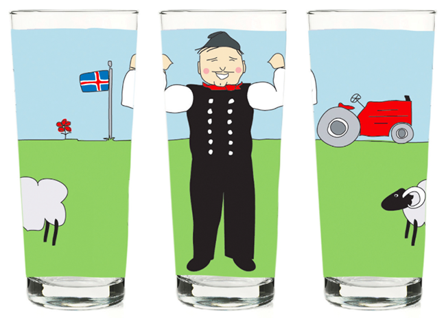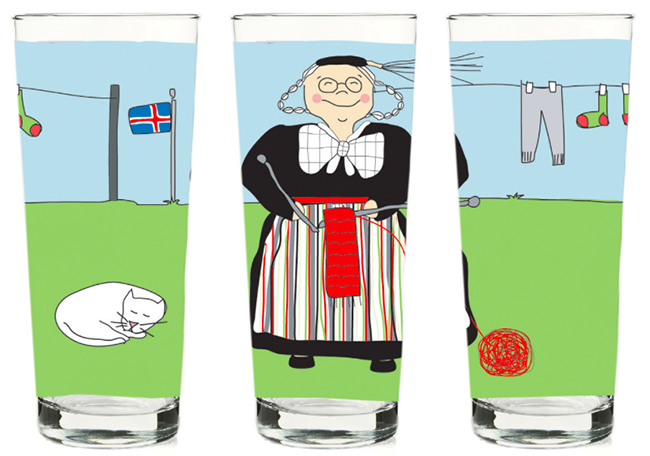 Fjölskyldan mín eru skemmtileg glös sem sköpuð voru til að brjóta upp hversdagsleikann á heimilinu. Þemað er hin íslenska fjölskylda, þjóðbúningurinn okkar, torfbæirnir, kindin og sveitin fagra sem tengja okkur fortíðinni og rótum okkar.