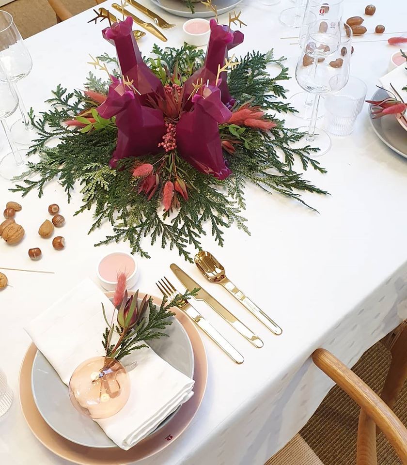 Borðið er skreytt hönnun Þórunnar, Pyropet kertum í nýjum lit sem mynda aðventukrans, borðstellið er frá iittala og heitir Teema, ásamt Essence glösum frá iittala og iittala jólakúlur eru notaðar sem skraut á diskana. Hnífapörin eru frá HAY, vatnsglösin eru Ripple frá Ferm living og bleiku skilaboðakertin eru einnig hönnun Þórunnar Árnadóttur frá Pyropet.