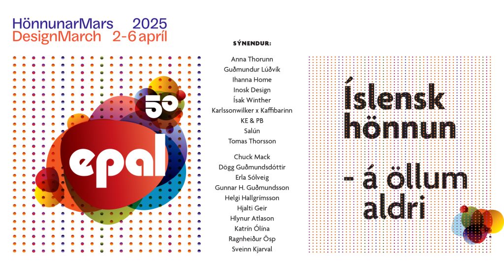 Epal fagnar í ár fimmtíu ára afmæli sínu og tekur þátt í HönnunarMars sautjánda árið í röð með vandaðri sýningu á íslenskri hönnun. Til sýnis er hlaðborð af nýrri og áhugaverðri hönnun eftir fjölbreyttan hóp íslenskra hönnuða sem hafa náð góðum árangri á sínu sviði bæði hérlendis og sumir einnig á erlendri grundu. Í Epal verða einnig til sýnis íslensk húsgögn sem eiga það sameiginlegt að hafa náð hæstu hæðum varðandi sölu- og verðmætasköpun og minna þau á mikilvægi og gildi góðrar hönnunar sem nýta má sem verðmæta auðlind.