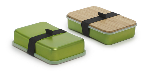Nýju nestisboxin frá BLACK+BLUM eru stórsniðug en líka smart. Lokið sem er úr bambus er hægt að nota sem bretti til að skera meðlæti á, t.d. epli og tómata, einnig virkar það sem hinn fínasti diskur. Nestisboxið er úr áli og er því einstaklega létt og kemur það í þremur litum, silfur, grænum og bleikum.