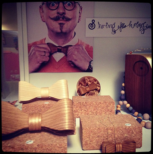 Mugga slaufurnar eru flottar en Guðmundur Jón Stefánsson, húsgagnasmíðameistari, mótar slaufurnar úr tré.