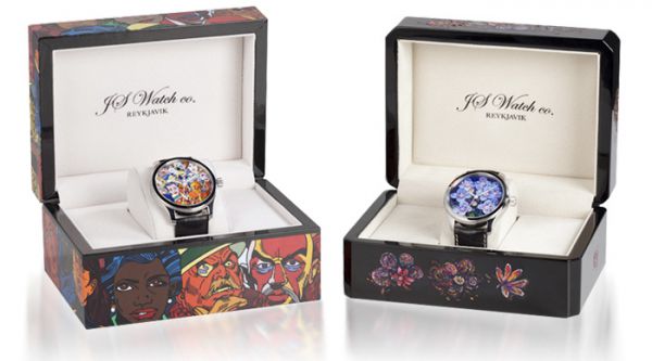 Nú rúmu ári síðar er afrakstur þessa samstarfs tilbúinn, tvö glæsileg úr og öskjur sem skarta listaverkum Erró og Eggerts Péturssonar og er því um afar sérstaka skartgripi að ræða sem munu án efa vekja eftirtekt og aðdáun um ókomna tíð.