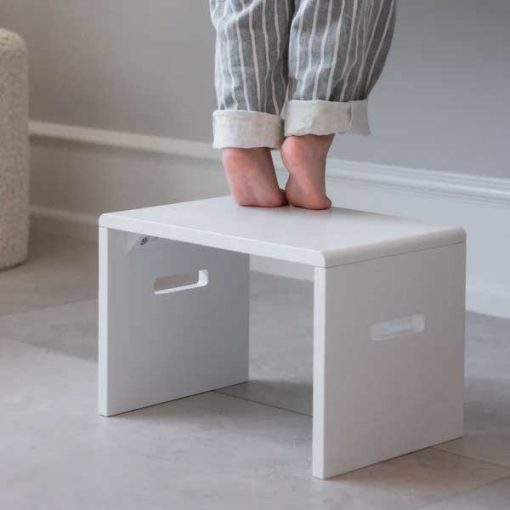 The step stool is 23.5 cm high and designed to stay stable and secure on the floor without sliding under the bed when the child steps onto it. You can apply the included silicone stickers to make the stool more slip-resistant and protect the floor. Two handles carved into each side make it easy to move around, and its simple, classic design perfectly complements the Sebra Bed.