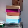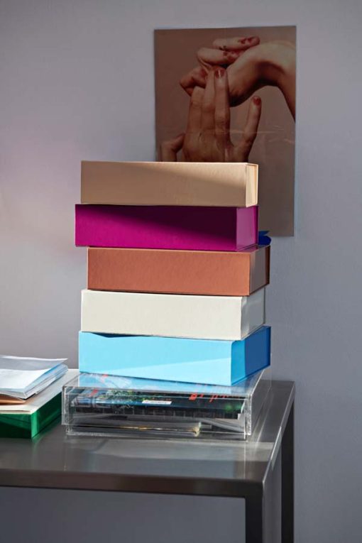 Colour Storage is a series of versatile and decorative storage containers. Made in a durable, extra thick FSC-certified cardboard mix with a beautiful glossy finish, the rectangular boxes can be used for organising and storing a wide range of items on desks, shelves or cupboards. Available in several different colours, the boxes can be stacked in colourful displays or used alone as a simple statement.