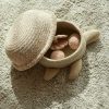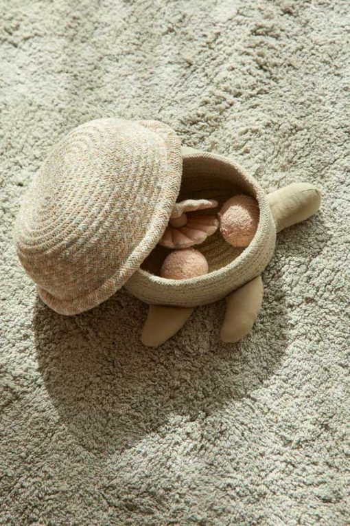 Help the Baby Turtle reach the ocean shore! Handcrafted by braided cords of recycled PET-bottles yarns mixed with our cotton colors, the Baby Turtle basket has a tiny head and paws of olive green organic cotton. Open the lid and hide your little treasures!