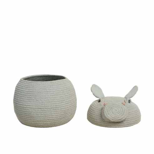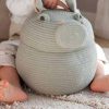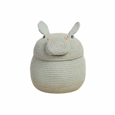 As happy as a Hippo! With a slightly round-shaped lid, the Henry the Hippo basket is handcrafted using a braided cord made of fibers from recycled PET bottles mixed with our Blue Sage cotton. With ears in matching color canvas and knotted pink nostrils, your hippo friend will keep your little treasures safe.