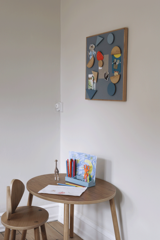 The Noticeboard has a frame made of high-quality solid ash with a magnetic plate covered with a beautiful graphical print on cotton canvas. The magnets are made in ash with rounded edges and come in douche colours (non-toxic paint). Together it combines a modern look with a timeless design that allows it to integrate seamlessly anywhere in the home.