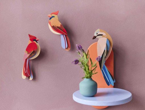 Garden birds chirp around us, pecking at some crumbs, glancing around, then fluttering away. They add color to our daily lives. These cardboard cardinals won’t fly away and can be given a lovely spot on your wall.