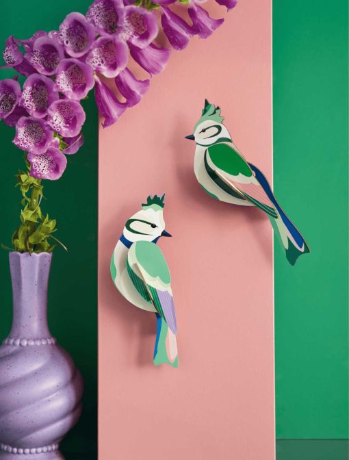 Garden birds chirp around us, pecking at some crumbs, glancing around, then fluttering away. They add color to our daily lives. These cardboard birds won’t fly away and can be given a lovely spot on your wall.