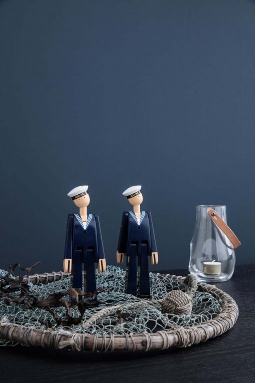 Kay Bojesen was inspired by several uniformed bodies, which can be seen in, among others, Garderen and Politimanden. The original Marine figure has a charming expression with a slimmer silhouette and the hat at an angle. The dark blue uniform, the slanted hat and the striped collar give a nice maritime look. Kay Bojesen went on a voyage and on his way he sailed as the only registered passenger on a Russian cargo ship named Minsk. Kay Bojesen’s statement about the sailors was thus „They became all my friends and the ship my home“.