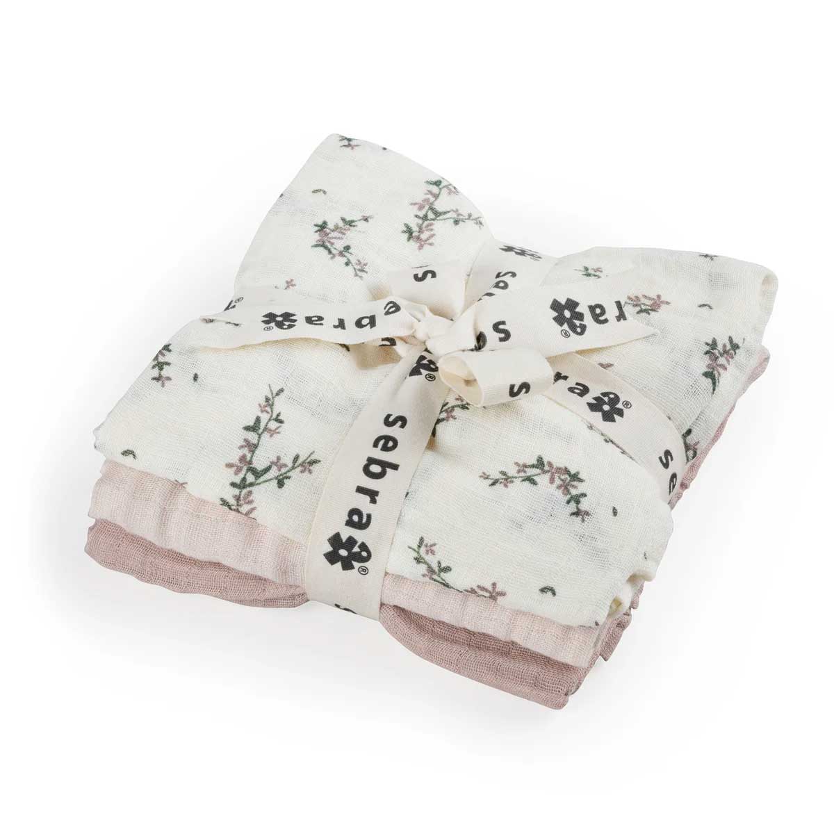 A set of three muslins, each measuring 75×75 cm, made from organic muslin cotton. The pack includes two solid-coloured muslins in matching shades and one with the unisex Blue Olive print.