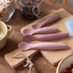 Use the silicone spoons for the first bowl of food – gruel, mash and porridge. The soft spoon will feel comfortable in your baby’s mouth, and the spoon’s movement makes it easy to catch the relatively liquid food and to „wipe“ residue away from the area around your baby’s mouth.
