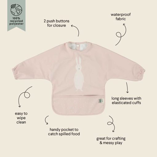 Fun and laughs at the table with your favorite animal friend! This cheerful bib comes with practical long sleeves and keeps your baby’s clothes clean while enjoying a nice meal, drink, or snack. The handy pocket makes sure all spilled food is neatly caught, making much less of a mess. More good news: the fabric is waterproof and made from 100% recycled polyester! It is easy to wipe clean and saves you a lot of washing or cleaning time.