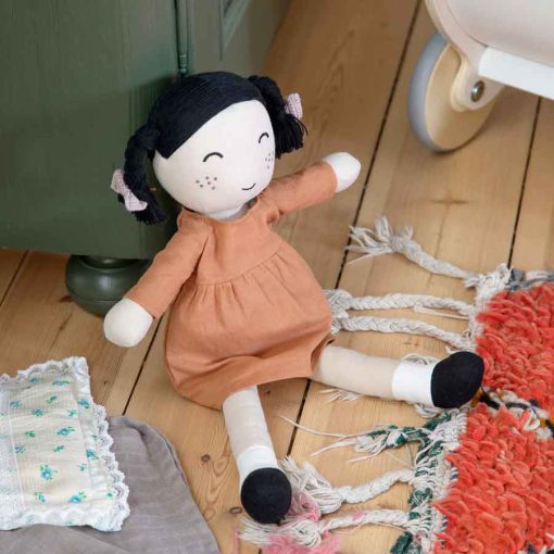 Li is an adorable fabric doll who will quickly become your little one’s best friend. Her body and dress are made from cotton and linen and her beautiful dark hair is sewn on. Li is 43 cm long and filled with soft recycled polyester.