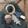 The cute rattle in muted colours consists of a mushroom, an acorn and a leaf hanging from a wooden ring. The acorn contains a little bell that tinkles softly when the child shakes the rattle. The three objects are made from certified organic cotton both inside and out, and the wooden ring is made from FSC™-certified wood.