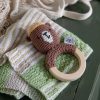 The bear is hand-crocheted in organic cotton and filled with recycled polyester, which is inside a small bag so it doesn’t find its way out through the yarn. The brown crocheted bear has a yellow cap and is mounted on a wooden ring with soft edges which are easy for little hands to hold on to. In total, the rattle is 15 cm long.