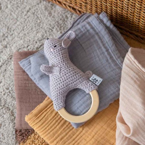 The rabbit is hand-crocheted in organic cotton and stuffed with recycled polyester, which is inside a small bag so it doesn’t find its way out through the yarn. The crocheted rabbit features embroidered details and is mounted on a wooden ring with soft edges that are easy for little hands to hold on to. In total, the rattle is 17 cm long.