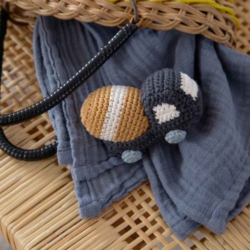 Crochet rattle shaped like the cement lorry from Sebra’s Busy Builders theme – a building universe full of fun, activity and excitement about working together to make things happen and create something great.