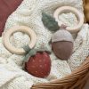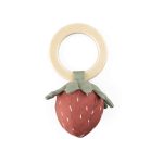 Rattle designed to resemble a soft strawberry that tinkles softly when baby grabs the wooden ring and shakes the rattle.