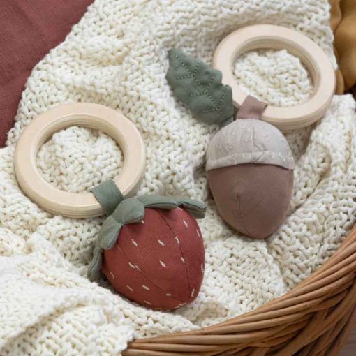 The strawberry is made from certified organic cotton both inside and out and features embroidered details and filling. The wooden ring with the strawberry has soft edges that are easy for small hands to hold on to. The wooden ring is made from FSC™️-certified wood. The rattle is 16 cm long.