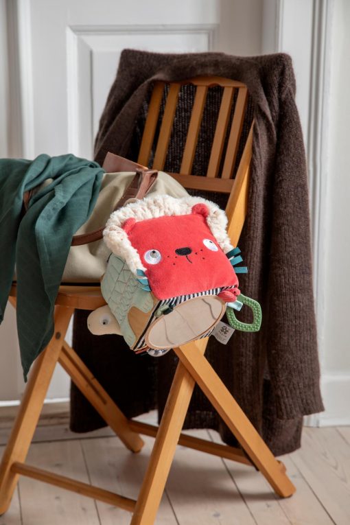 Soft textile activity cube with baby mirror, teething ring and fun textures.