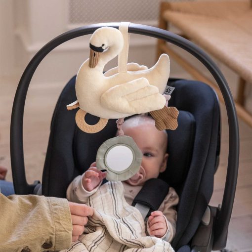 Activity toy shaped like an elegant swan in soft velour – filled with little sensory surprises that invite play and exploration. The practical strap with Velcro fastening makes it easy to attach the toy to the car seat, pram, or activity gym, keeping it always within reach.