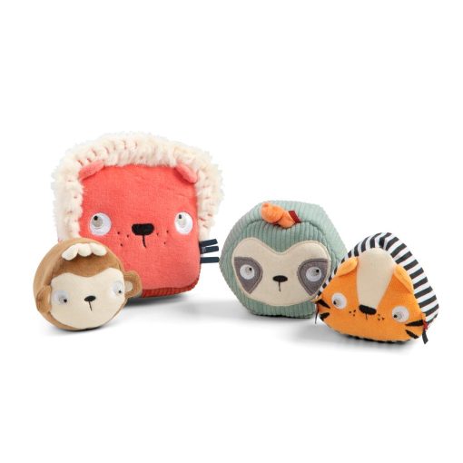 Simple and fun stacking blocks/stacking tower with four animal faces shaped like different geometric shapes.