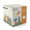 Fun is guaranteed with these stacking blocks! There is a different theme to discover on each side of the block. This allows kids to learn in a playful manner. The set consists of 10 colourful blocks. Kids can either stack the blocks, do a nice animal puzzle, sort the blocks by size, or learn numbers and objects. There are numerous ways to play with these blocks, making them an absolute must-have among children’s toys!   These blocks are made from strong FSC© cardboard and soy ink.