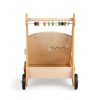 The walker comes with rubber wheels that make moving it around easy and noiseless. The two front wheels act as shock absorbers in case the child bumps into walls and other obstacles. The walker becomes even more stable when e.g. books are placed on the small shelf. There’s also a room for a favourite teddy to sit.