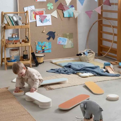Flexible 13-piece balance track for training play and motor skills. Children can spend hours putting the different pieces together to create exciting balance- or obstacle courses. Balance stones can be placed on the floor individually or stacked under the balance boards to give the course height. Two of the balance boards can tilt, adding even more challenge to the game.