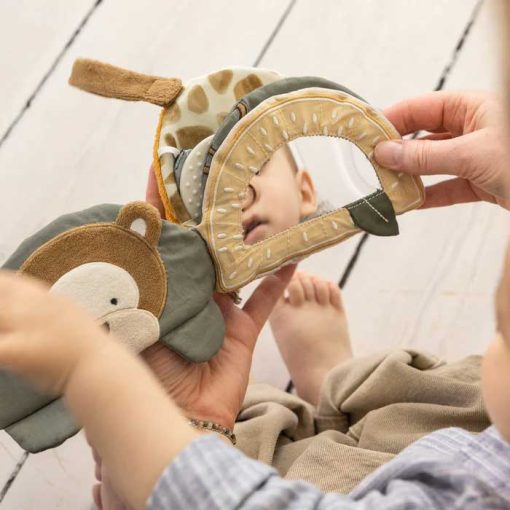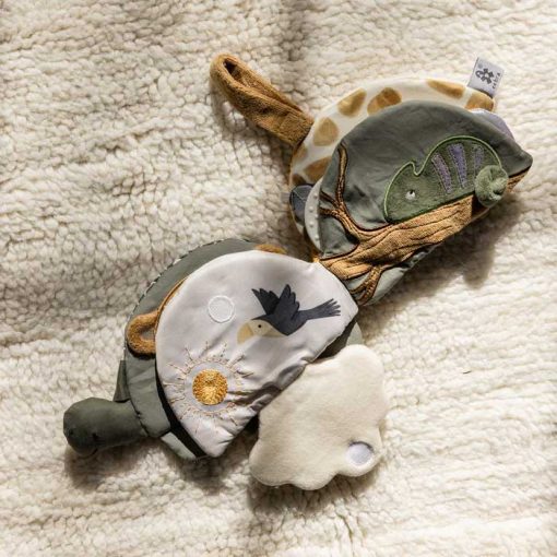 Entertain your baby with a soft fabric book and activity toy in one, shaped like Turbo the Turtle. The fabric book features eight engaging pages and a practical velcro strap, making it easy to hang up.