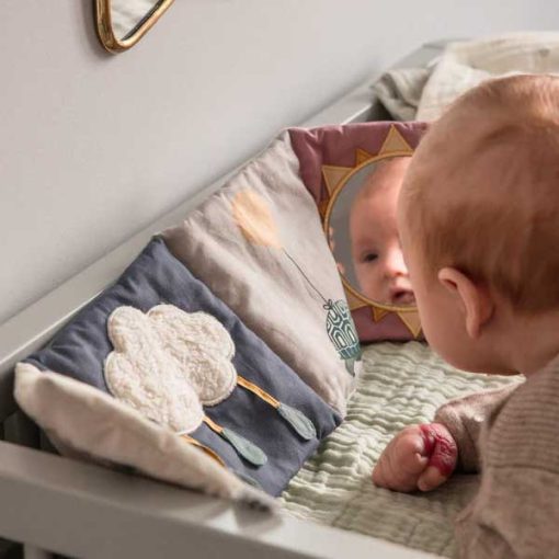 The fabric book can be flipped according to mood, inspiring countless stories based on the illustrations. Use the book in the lift or stroller for a cosy moment or while on the go. It can also serve as motivation for tummy time, helping your baby strengthen their neck muscles during playtime on the floor.