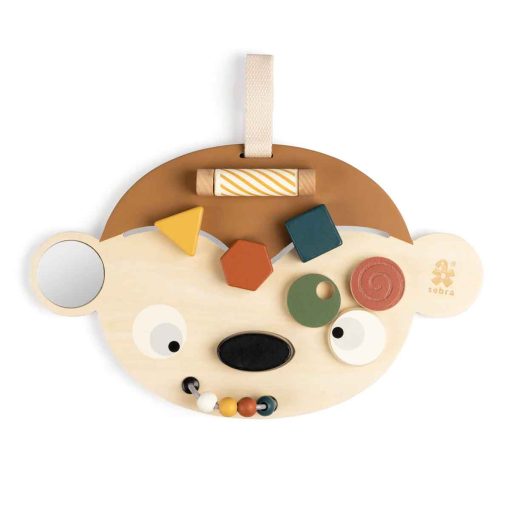 The activity board is made of wood and is ideal for hanging on the wall, taking with you in the pushchair or using when baby is lying on the floor exercising their neck. The board is filled with activities that strengthen children’s fine motor skills and stimulate their curiosity.