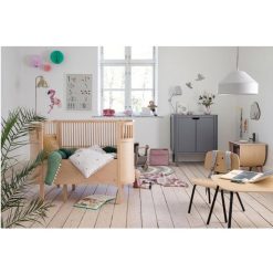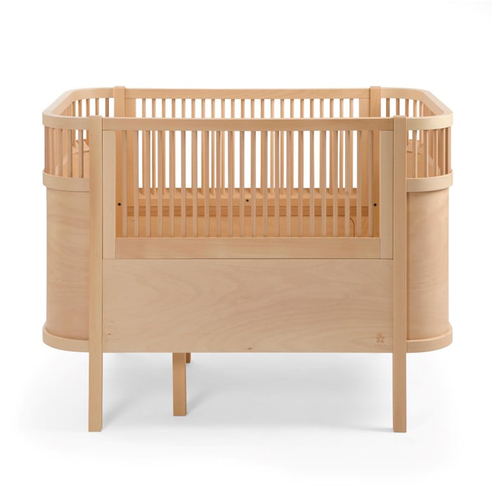 The bed is made from certified wood and carries the EU Ecolabel, among other certifications. The height-adjustable base can be set at the highest position for newborns, providing a comfortable height for placing or lifting your baby from the crib.