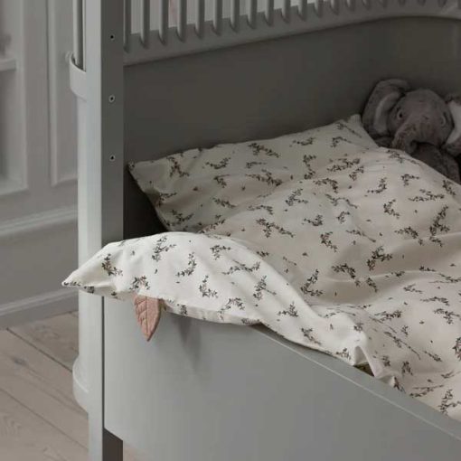 The bed linen includes a duvet cover and pillowcase in baby size. Both have a good YKK zip, which is concealed so as not to disturb sleep. As an additional detail, the duvet cover has a small leaf flap, which acts as a comforter for sleepy fingers.