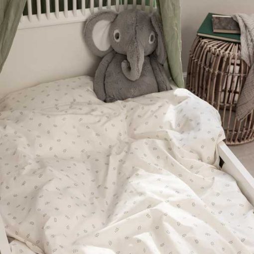 Percale is a fine, densely woven material with a matte finish and a crisp softness that becomes even nicer after every wash. The delicate little leaf pattern, Sophora Leaves, is printed on a light beige base colour, making it neutral and easy to use for several siblings. Match it with a baby bumper in the same print or a solid colour alternative.