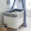 The Kapok baby bumper fits the Sebra Bed, Baby & Jr., with the base in the upper position and a standard crib measuring 60 x 120 cm. You can adjust the bumper to fit a smaller crib by overlapping it, for example, at the foot end. The tie straps allow you to secure it to the crib at the top and bottom.