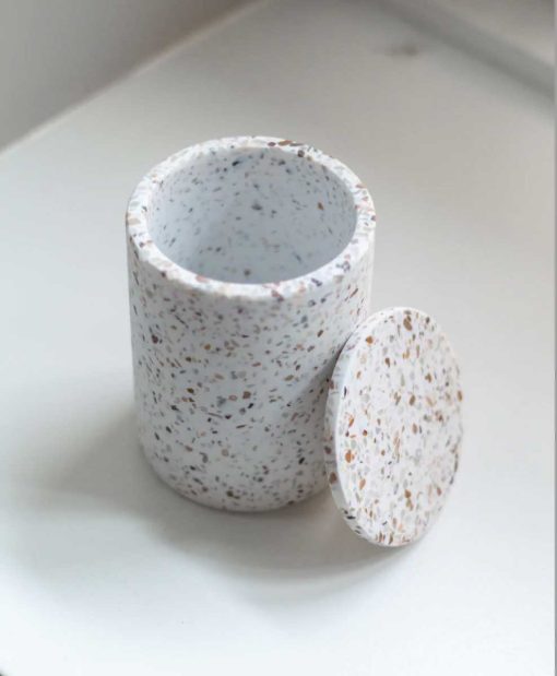 Beautiful vase made from terrazzo. Use it for storage in the bathroom or kitchen and as a stylish touch into your home.