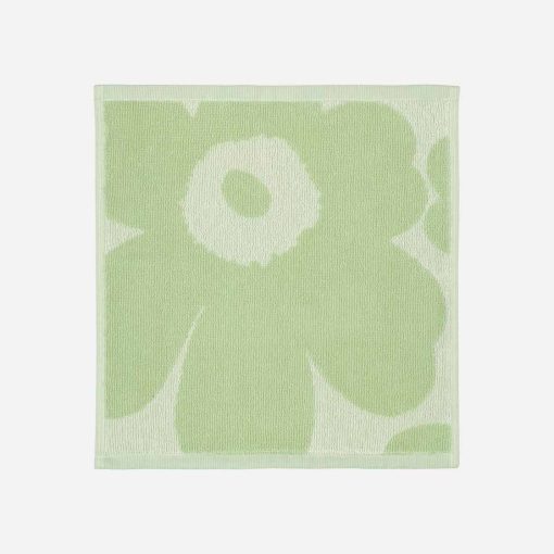 The Unikko pattern hand towel is made of organic cotton terry. The pattern’s colors are reversed on the other side of the towel.