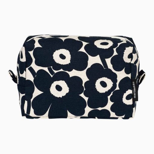 The roomy Vilja cosmetic bag is made of an unbleached cotton and linen blend with a stain-repellent finish on the outside. The bag has a zipper closure as well as a nylon lining, two large pockets, and places for brushes on the inside. The dark blue Mini Unikko (poppy) pattern is printed in Helsinki.