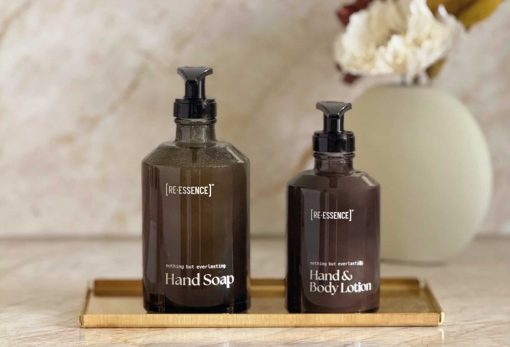 Both products come in matching glass dispensers, crafted in Italy and designed to be refilled again and again.