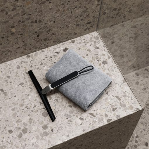 The shower wiper has a replaceable wiper blade in soft rubber, which easily removes water from smooth surfaces. The handle in rubber coated solid steel has a good weight, while the soft edges protect surfaces. The rubber strap makes it easy to hang up the shower wiper after use on the supplied hook The design of the Vipp shower wiper matches the bathroom collection from Vipp.