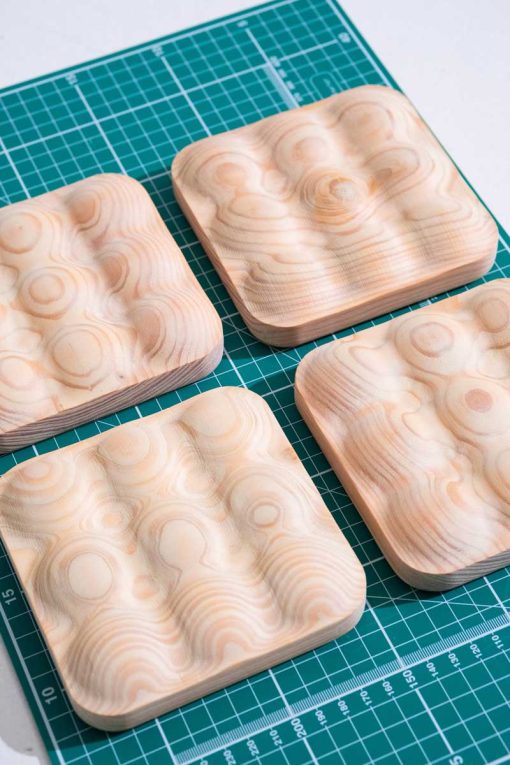 í vesturbæ Reykjavíkur. Hver bakki er unninn úr sama trjábolnum.