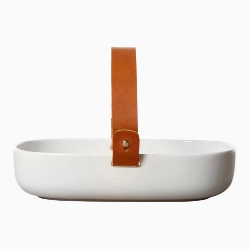 The Koppa serving dish is made of dishwasher, oven, microwave and freezer proof white stoneware. The leather handle is easy to remove and should be taken off before washing the dish.