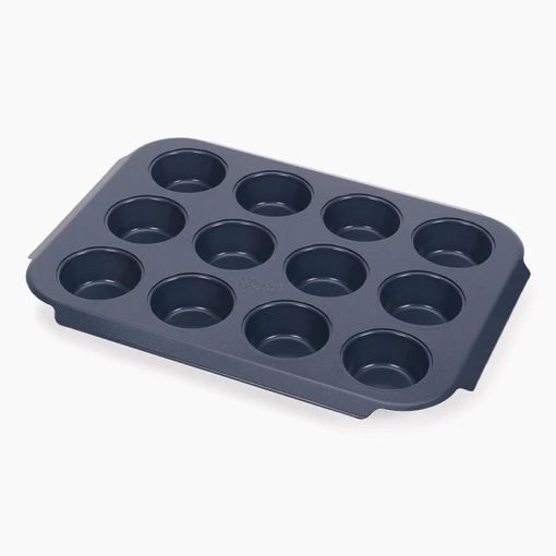 This stackable 12-cup muffin pan features easy-pull handles on the sides to provide a larger gripping point when wearing oven gloves, making it easier and safer to handle.