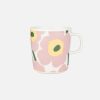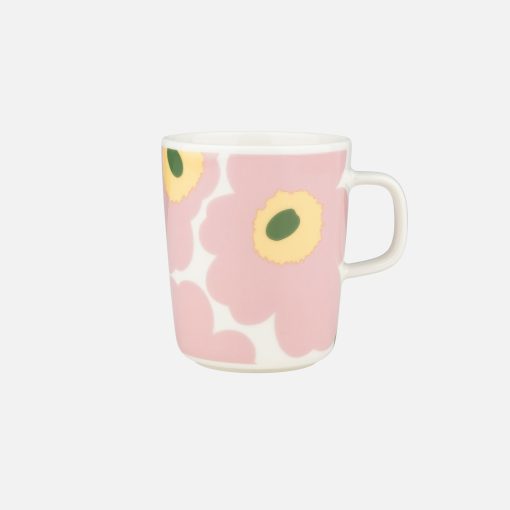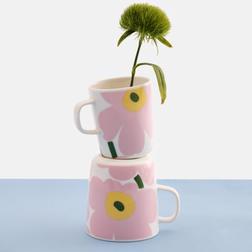 The Oiva mug with Unikko pattern is made of white stoneware that is dishwasher, oven, microwave and freezer proof.
